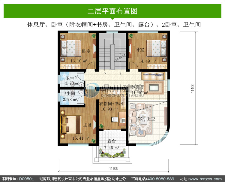| 二 層: | 休息廳、臥室(附衣帽間+書房、衛生間、露臺)、2臥室、衛生間 | |||