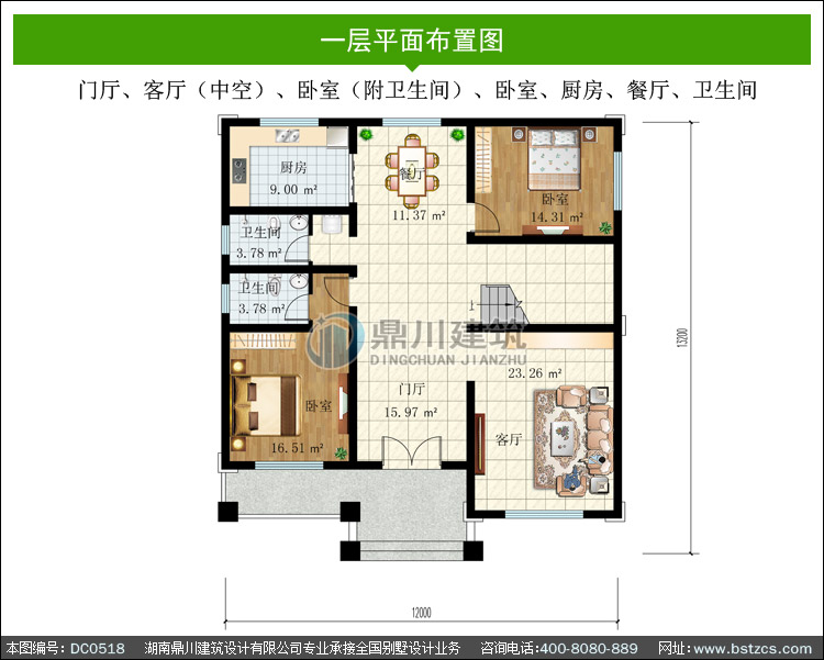 | 一 層: | 門廳、客廳(中空)、臥室(附衛生間)、臥室、廚房、餐廳、衛生間 | |||