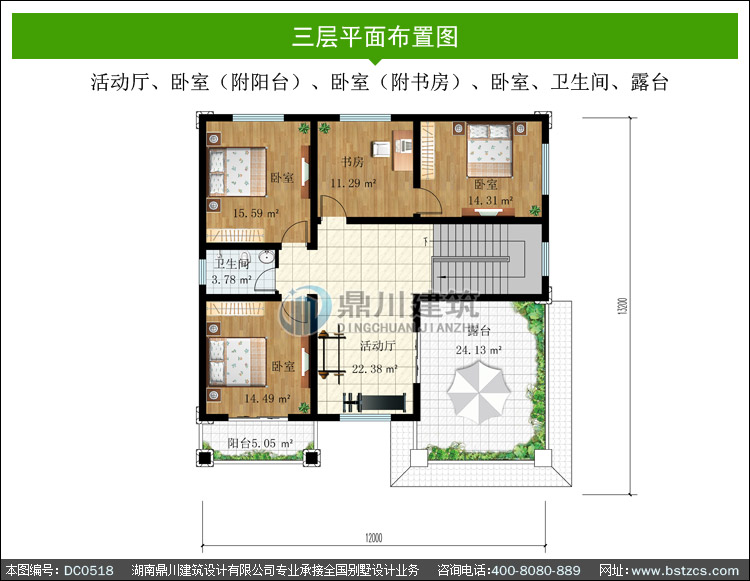 | 三 層: | 活動廳、臥室(附陽臺)、臥室(附書房)、臥室、衛生間、露臺 | |||