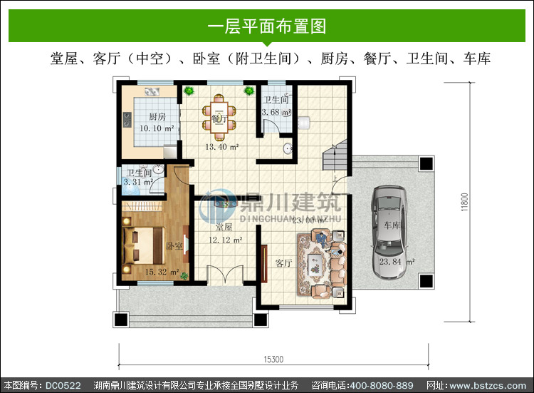 | 一 層: | 堂屋、客廳(中空)、臥室(附衛生間)、廚房、餐廳、衛生間、車庫 | |||