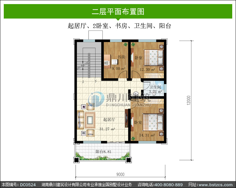 | 二 層: | 起居廳、2臥室、書房、衛生間、陽臺 | |||