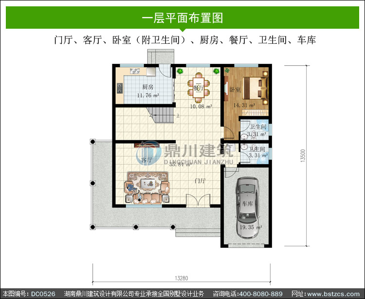 | 一 層: | 門廳、客廳、臥室(附衛生間)、廚房、餐廳、衛生間、車庫 | |||