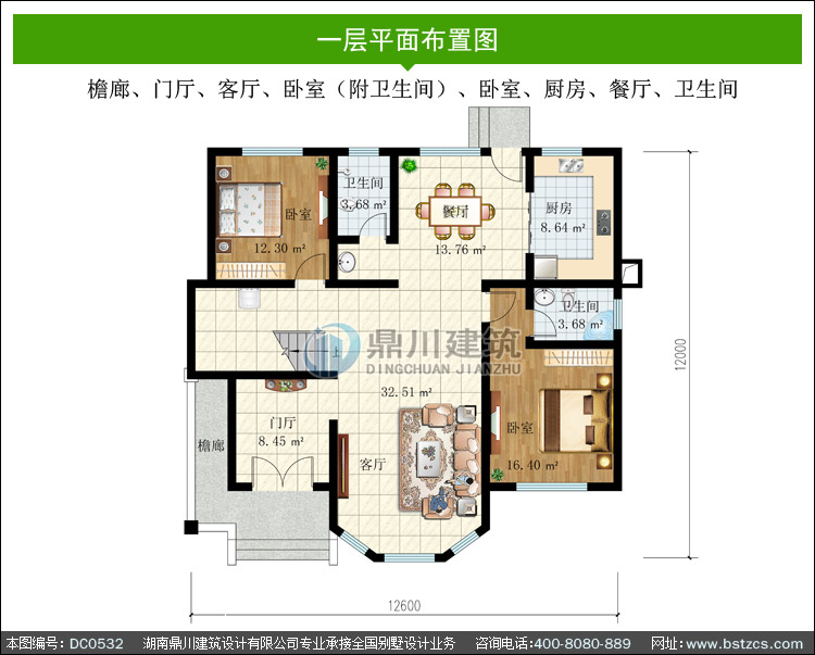 | 一 層: | 檐廊、門廳、客廳、臥室(附衛(wèi)生間)、臥室、廚房、餐廳、衛(wèi)生間 | |||