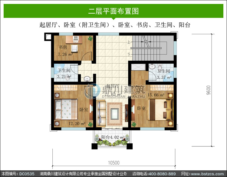 | 二 層: | 起居廳、臥室(附衛(wèi)生間)、臥室、書房、衛(wèi)生間、陽臺 | |||