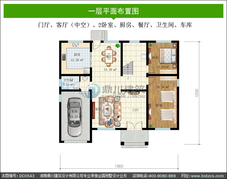 | 一 層: | 門廳、客廳(中空)、2臥室、廚房、餐廳、衛(wèi)生間、車庫 | |||