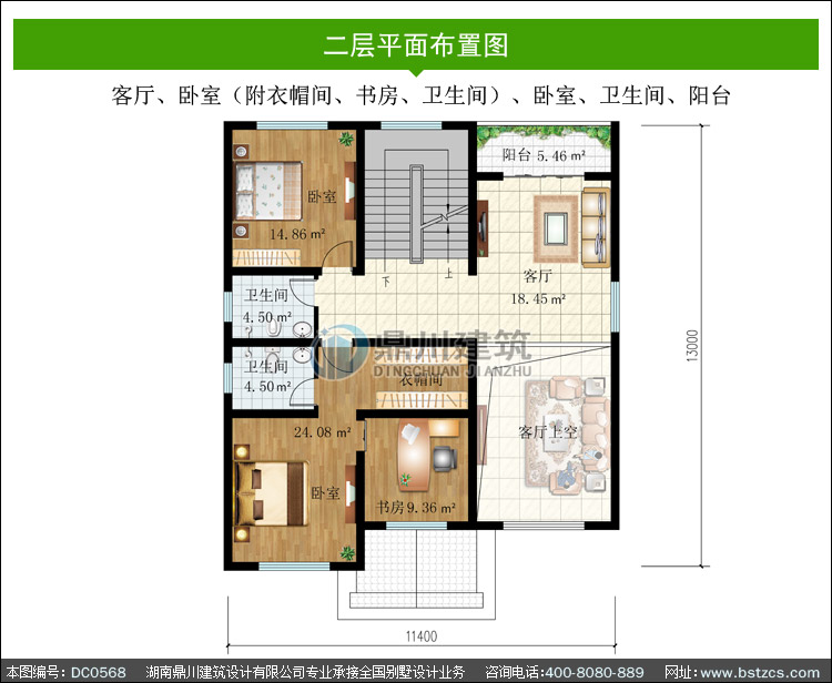 | 二 層: | 客廳、臥室(附衣帽間、書房、衛生間)、臥室、衛生間、陽臺 | |||