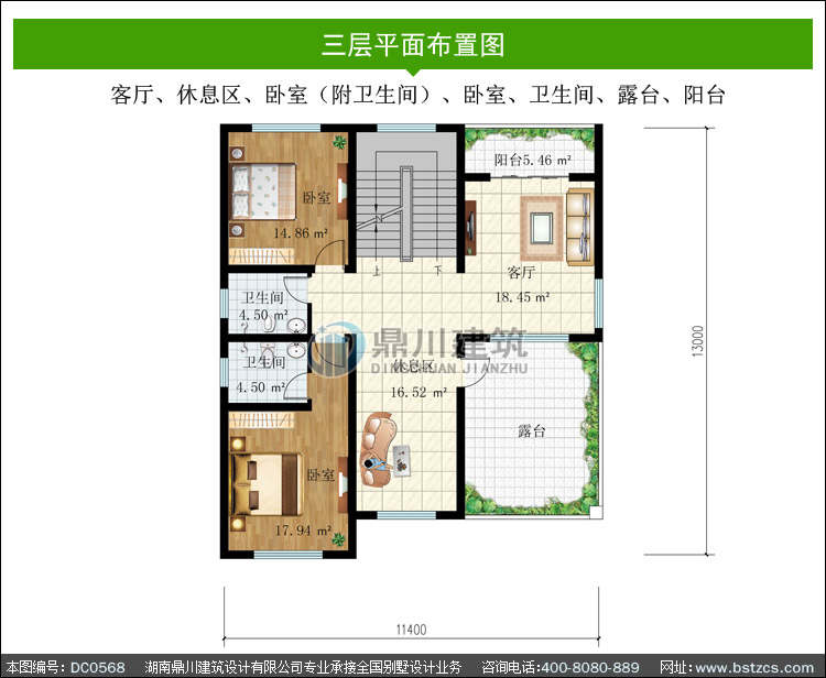 | 三 層: | 客廳、休息區、臥室(附衛生間)、臥室、衛生間、露臺、陽臺 | |||