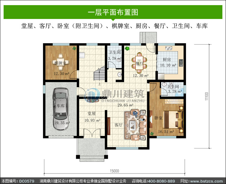 | 一 層: | 堂屋、客廳、臥室(附衛(wèi)生間)、棋牌室、廚房、餐廳、衛(wèi)生間、車庫 | |||