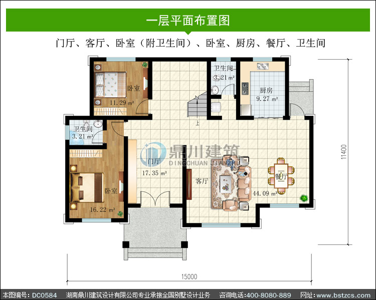 | 一 層: | 門廳、客廳、臥室(附衛生間)、臥室、廚房、餐廳、衛生間 | |||
