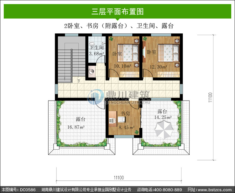| 三 層: | 2臥室、書房(附露臺)、衛生間、露臺 | |||