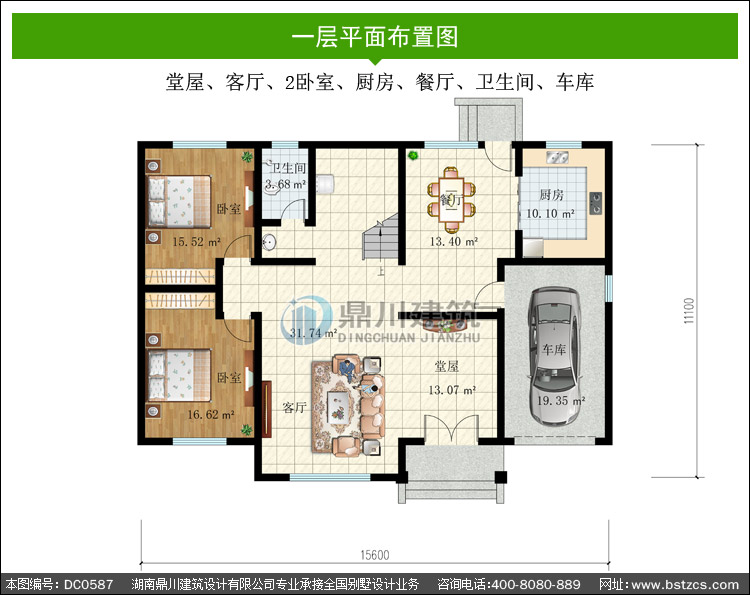| 一 層: | 堂屋、客廳、2臥室、廚房、餐廳、衛生間、車庫 | |||