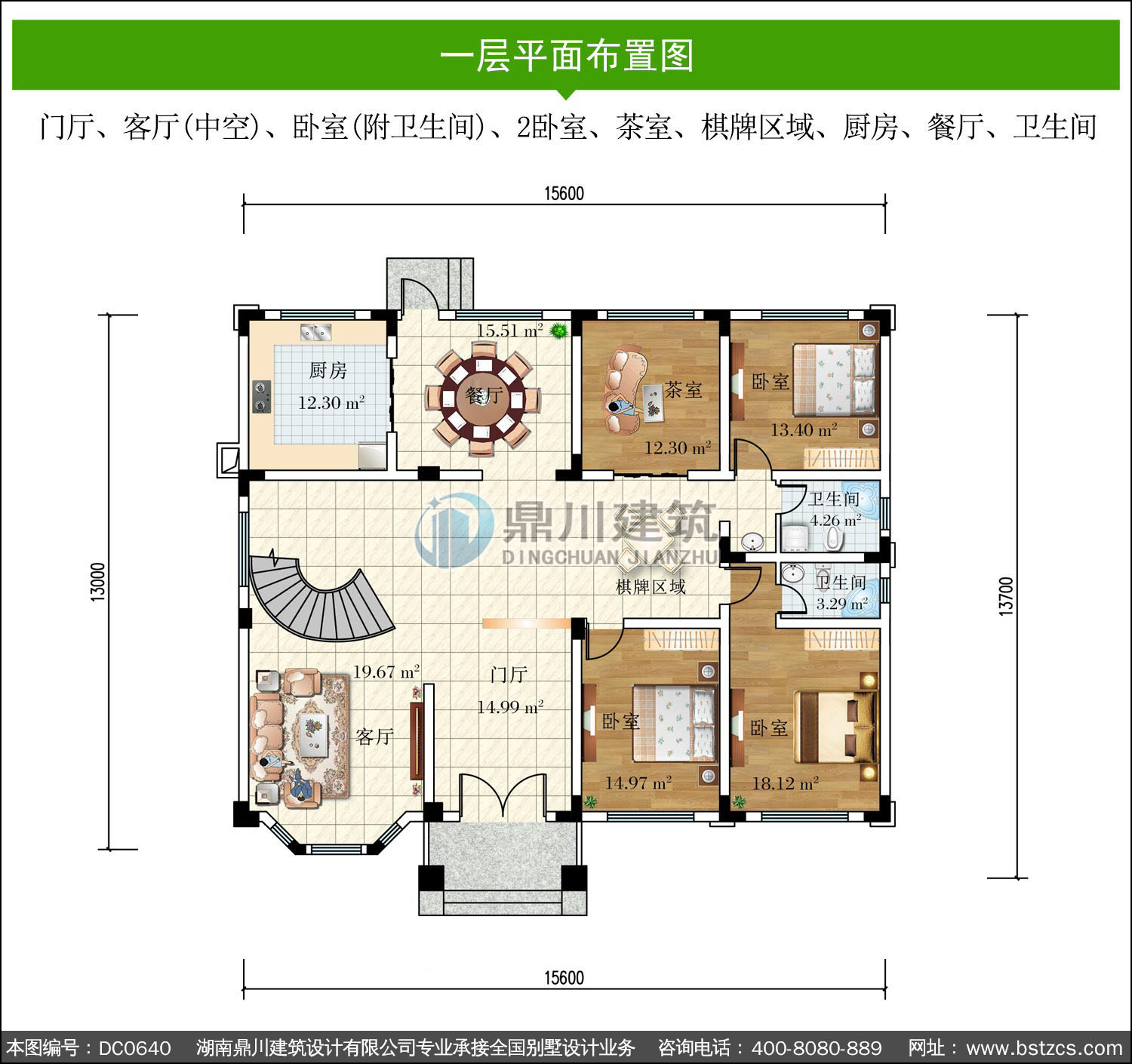 | 一 層: | 門廳、客廳(中空)、臥室(附衛生間)、2臥室、茶室、棋牌區域、廚房、餐廳、衛生間 | |||