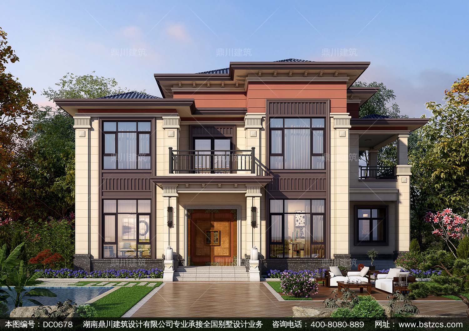 新中式二層帶露臺實用別墅效果圖及施工圖紙_農(nóng)村大氣兩層自建房設(shè)計,鼎川建筑