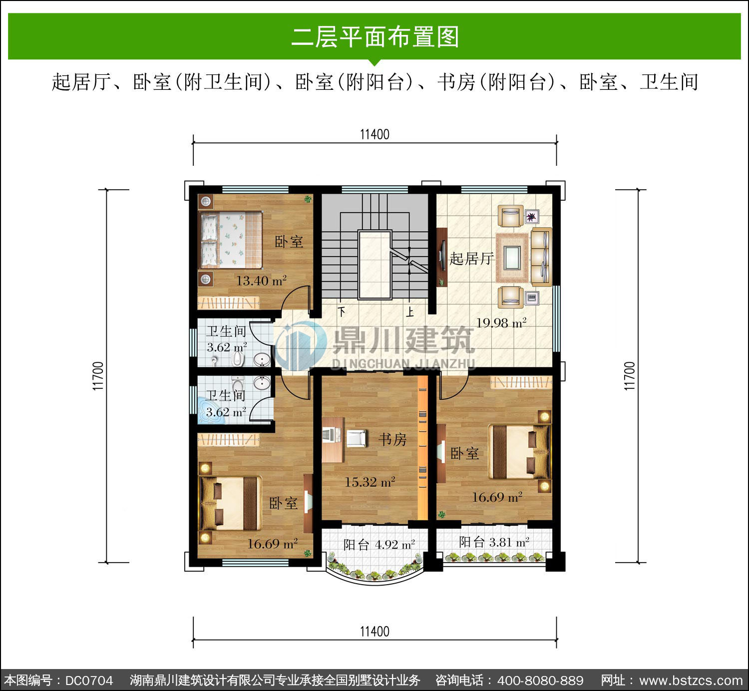 | 二 層: | 起居廳、臥室(附衛生間)、臥室(附陽臺)、書房(附陽臺)、臥室、衛生間 | |||