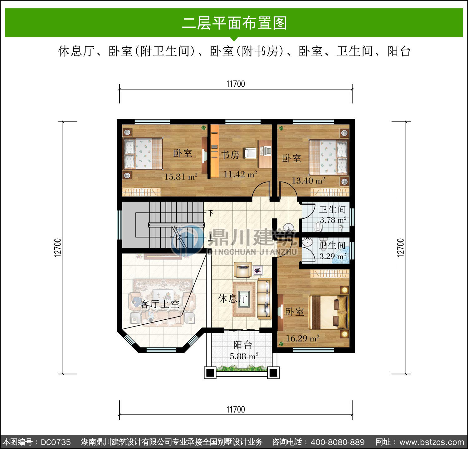 | 二 層: | 休息廳、臥室(附衛生間)、臥室(附書房)、臥室、衛生間、陽臺 | |||