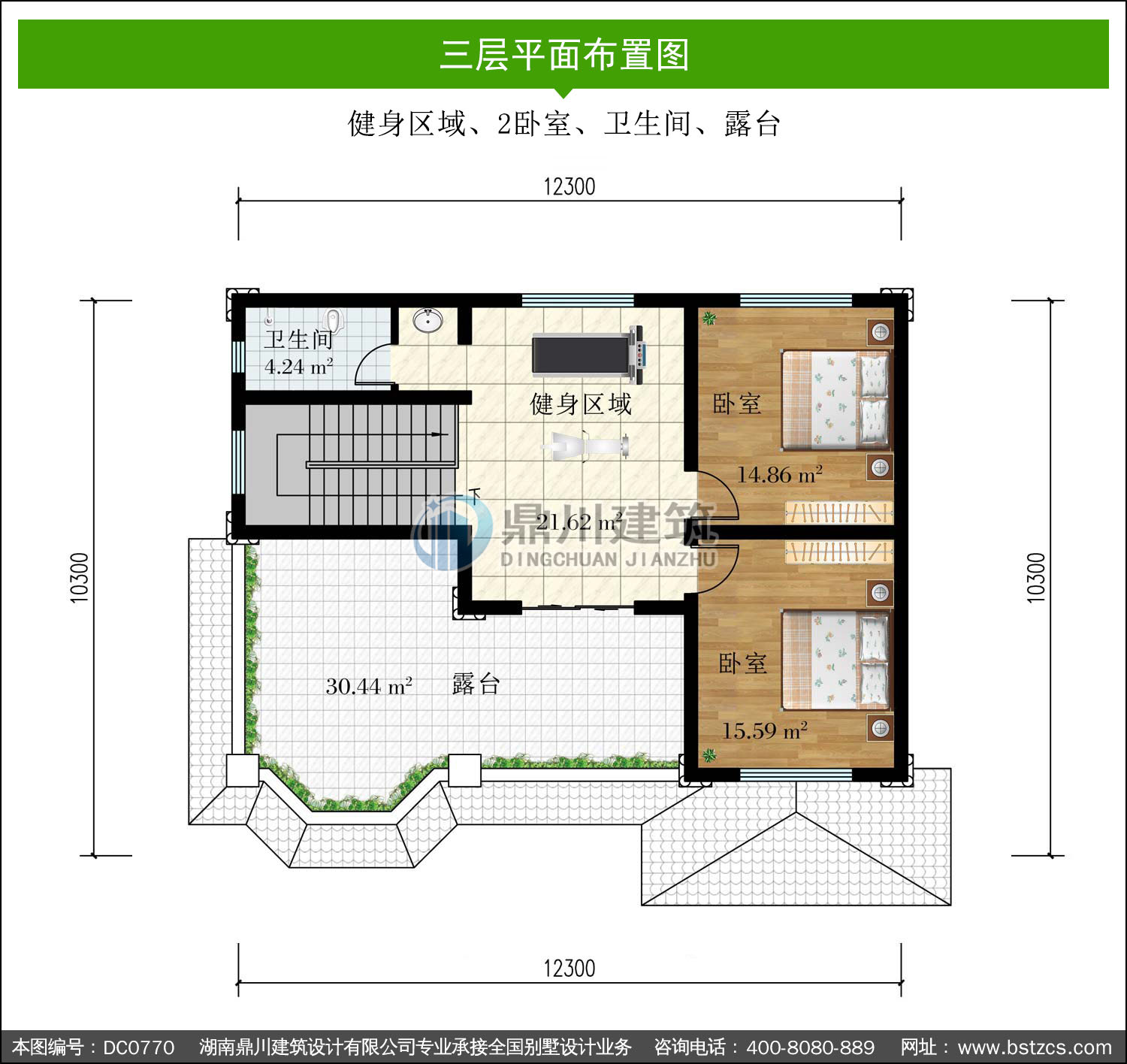 | 三 層: | 健身區(qū)域、2臥室、衛(wèi)生間、露臺 | |||