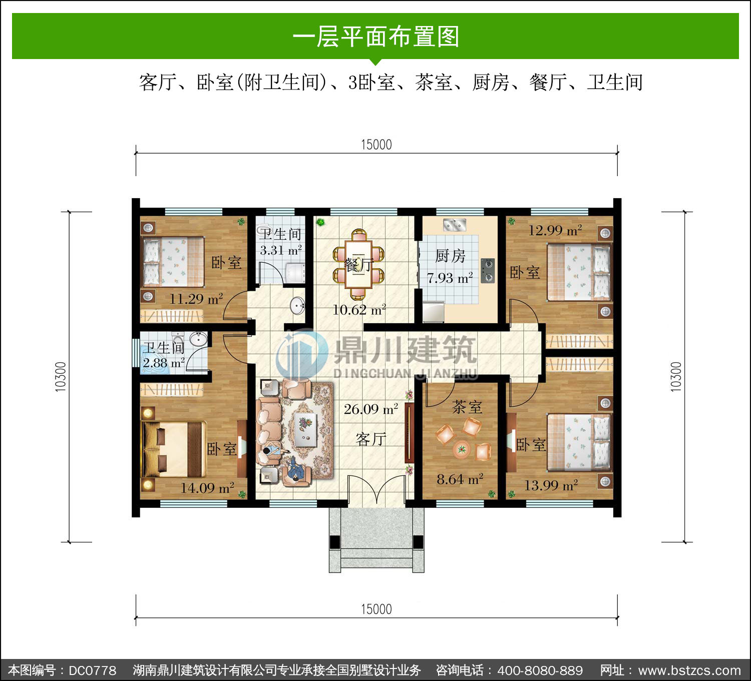 | 一 層: | 客廳、臥室(附衛(wèi)生間)、3臥室、茶室、廚房、餐廳、衛(wèi)生間 | |||