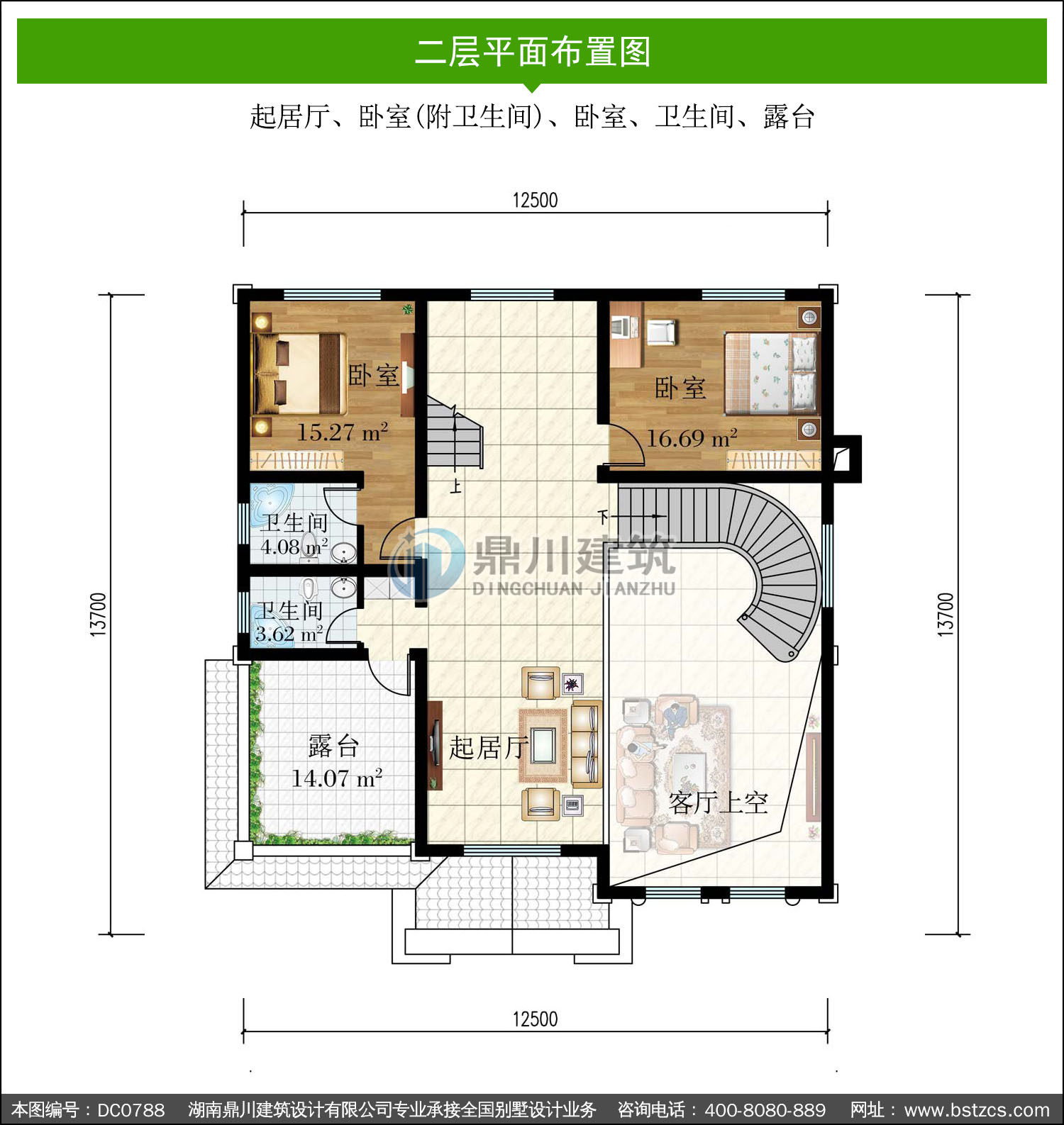 | 二 層: | 起居廳、臥室(附衛(wèi)生間)、臥室、衛(wèi)生間、露臺 | |||