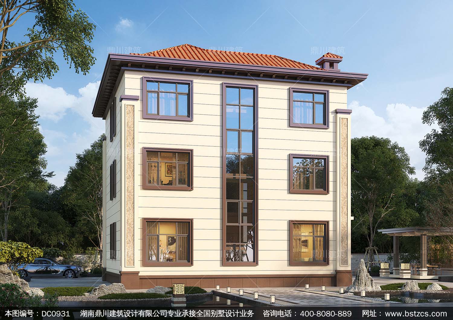 新中式三層挑空客廳別墅施工圖紙及外觀效果圖_農(nóng)村自建房設(shè)計,鼎川建筑
