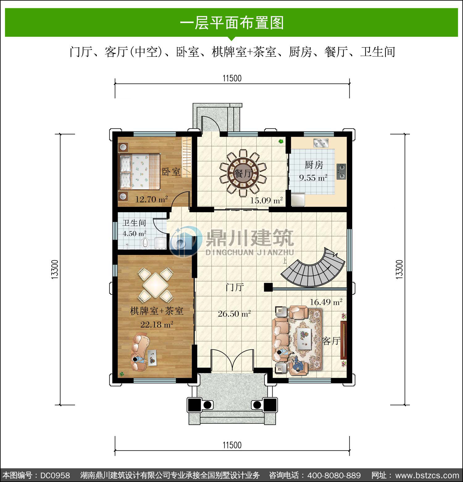 | 一 層: | 門廳、客廳(中空)、臥室、棋牌室+茶室、廚房、餐廳、衛生間 | |||