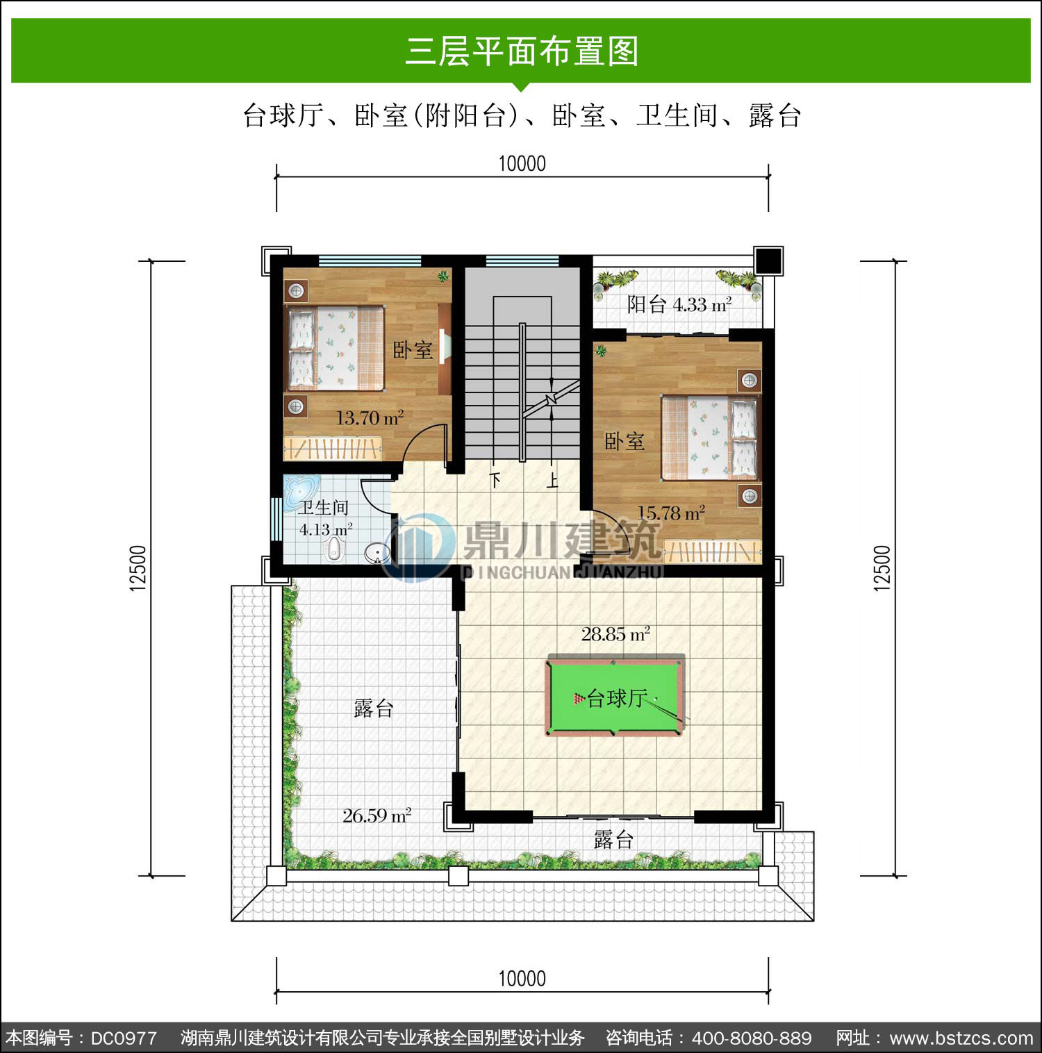 | 三 層: | 臺球廳、臥室(附陽臺)、臥室、衛(wèi)生間、露臺 | |||