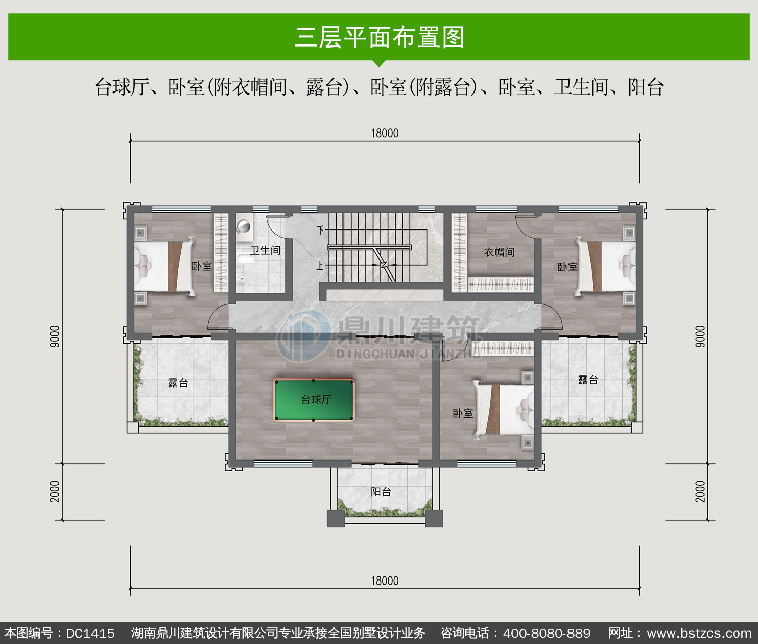 | 三 層: | 臺球廳、臥室(附衣帽間、露臺)、臥室(附露臺)、臥室、衛生間、陽臺 | |||